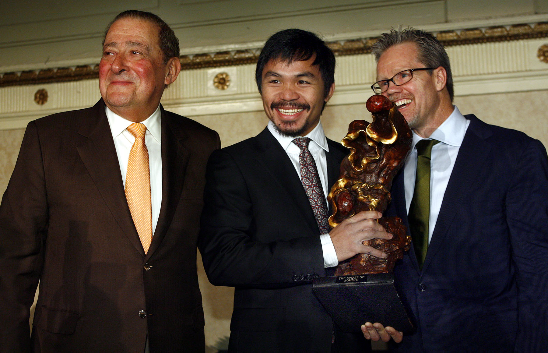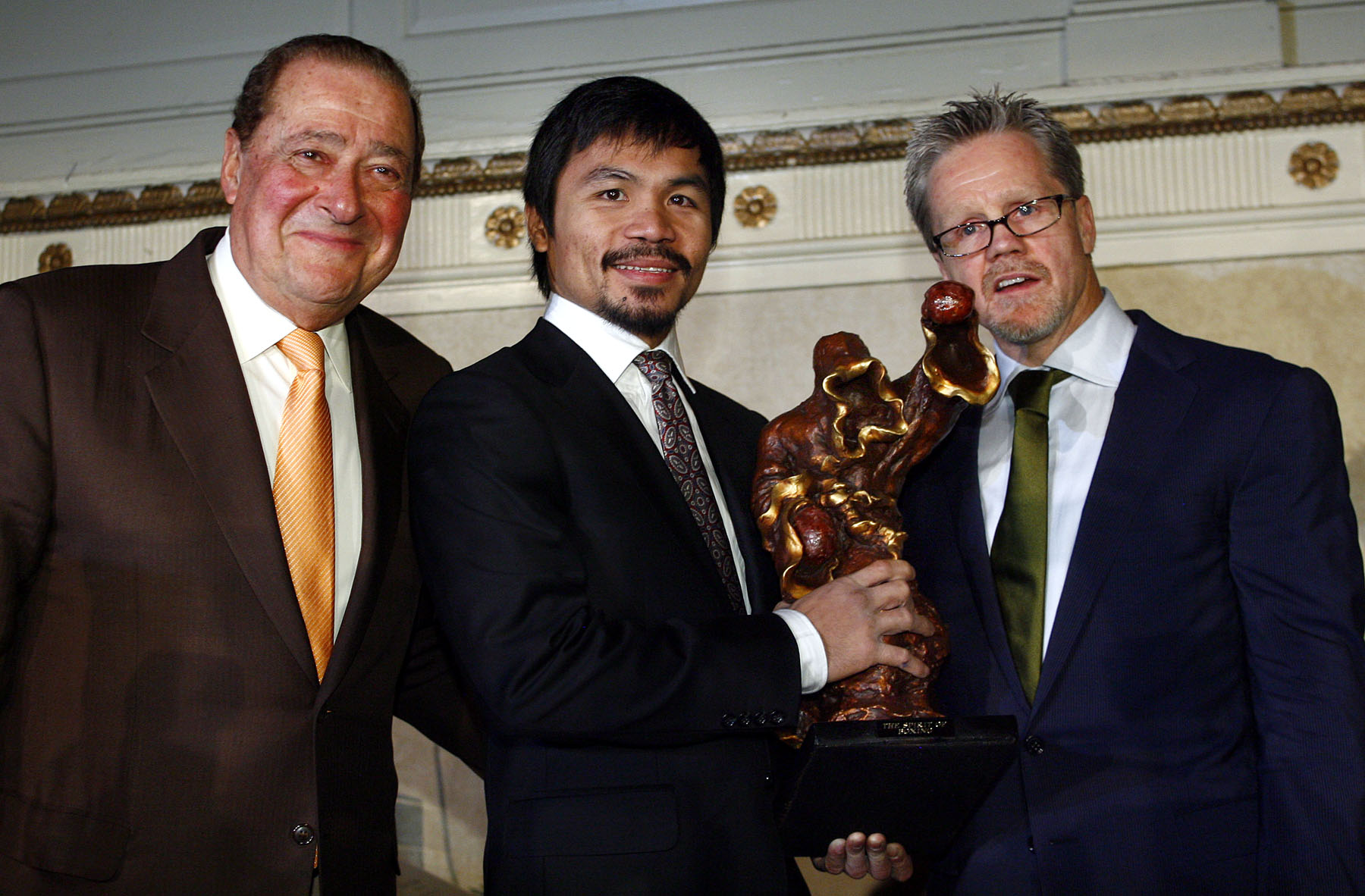Seven-time world champion Manny “Pacman” Pacquiao poses with Hall of Fame Top Rank promoter Bob Arum(L) and trainer Freddie Roach(R) after winning the “Fighter of The Year” and “Fighter of the Decade” awards at the 85th Annual Boxing Writers Association of America dinner in New York City Friday night.
