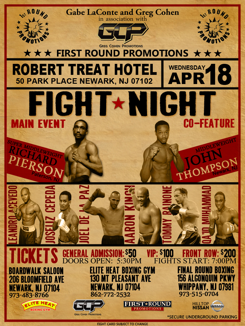 NEWARK, NEW JERSEY (March 20, 2012)—On Wednesday night April 18th, Gabe LaConte’s First Round Promotions in association with Greg Cohen Promotions presents a great night of boxing at the Beautiful Robert Treat Hotel in downtown Newark and Best Sports Books
