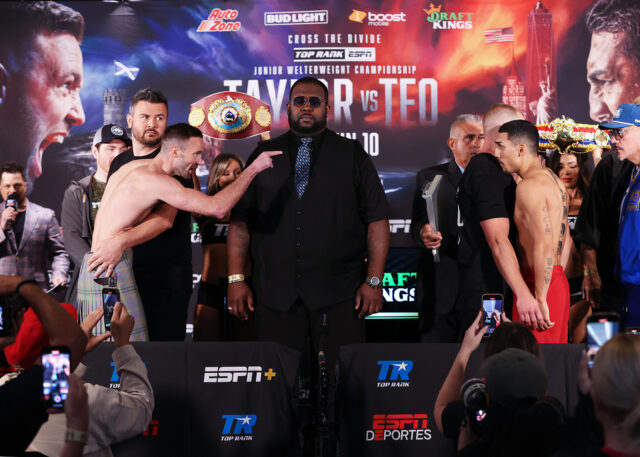 NEW YORK, NEW YORK - JUNE 09: Josh Taylor (L) and Teofimo Lopez (R) face-off during the weigh in prior to their June 10 WBO junior welterweight championship fight at The Hulu Theater at Madison Square Garden on June 09, 2023 in New York City. (Photo by Mikey Williams/Top Rank Inc via Getty Images)