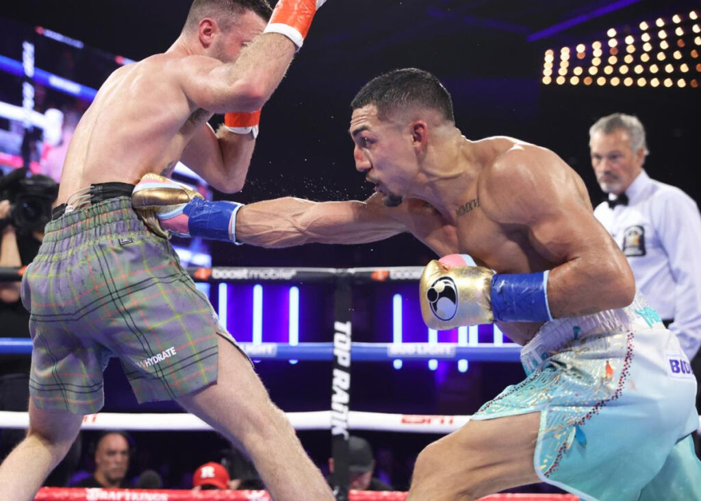 NEW YORK (JUNE 13, 2023) – NEW YORK–Teofimo Lopez became a two-division world champion with an emphatic 12-round unanimous decision over Josh Taylor to win the WBO Junior Welterweight title before a Madison Square Garden Theater record crowd of 5,151.