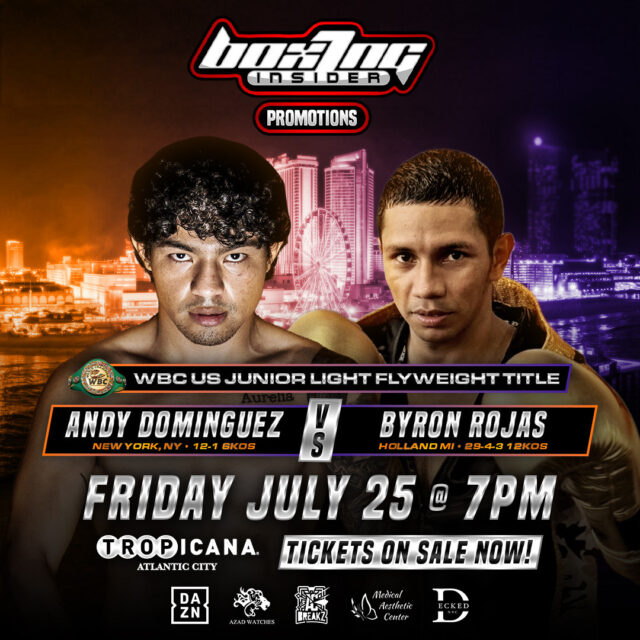 The main event features Bronx-born Andy Dominguez Velasquez (12-1, 6 KOs), who trains in Las Vegas and represents Mendez Boxing, against Byron Rojas (24-4-3, 12 KOs) for the vacant WBC US Junior Flyweight Silver title in a thrilling 50-50 fight.
