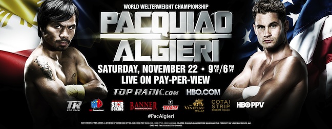 LAS VEGAS, NV (August 25, 2014) — Boxing’s only eight-division world champion and Fighter of the Decade Congressman MANNY “Pacman” PACQUIAO will defend his World Boxing Organization (WBO) welterweight title against New York’s undefeated WBO junior welterweight champion CHRIS ALGIERI, who has a Bachelor of Science degree in Health Care Management, a Masters Degree in Clinical Nutrition and a Ph.D. in Upsets Inside The Ring. Promoted by Top Rank® and Sands China Ltd., in association with MP Promotions, Joe DeGuardia’s Star Boxing, Banner Promotions and Tecate, the Pacquiao vs. Algieri world welterweight championship event will take place Saturday, November 22, at The Venetian® Macao’s Cotai Arena. It will be produced and distributed live by HBO Pay-Per-View beginning at